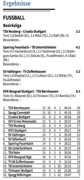 Das bittere Ende kam, als Maximilian Stockbauer unnötig einen Elfmeter verursachte, den der Gegner seinerseits kühl verwandelte. Vielleicht ganz gut für die Vaihinger: die Chance zur Wiedergutmachung haben sie bereits am heutigen Dienstagabend (19 Uhr). In Feuerbach steht für sie ein weiteres Nachholspiel an.