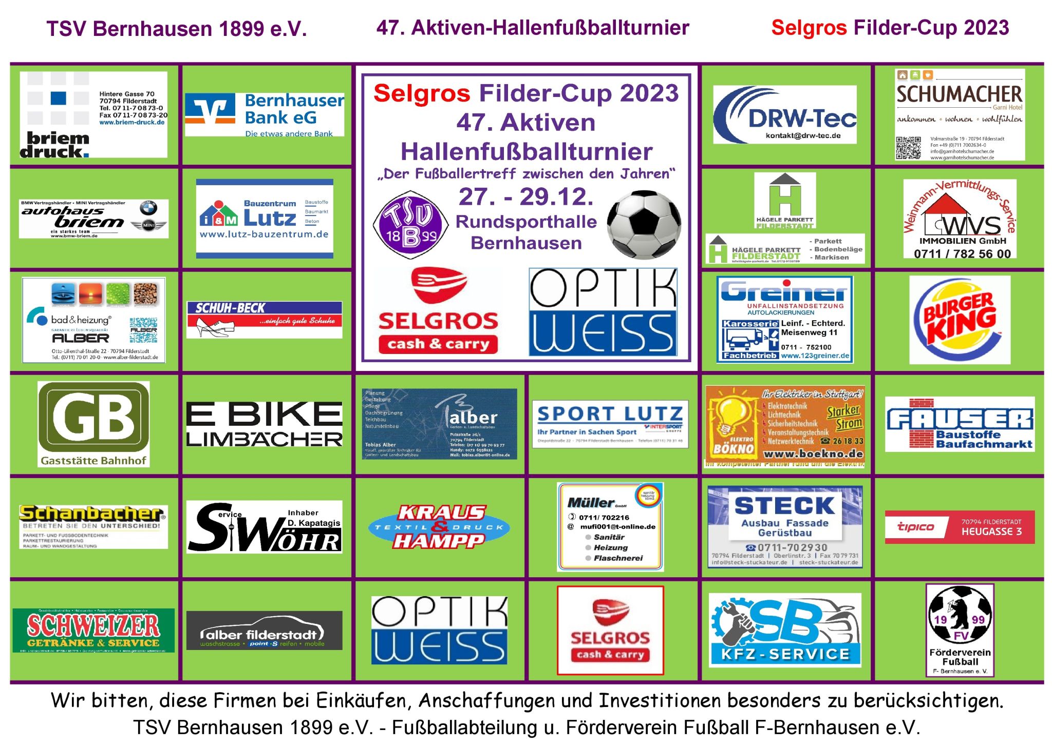 Selgros, OPTIK Weiss, Bernhauser Bank eG, Autohaus Briem GmbH & Co. KG, Briem-Druck GmbH & Co.KG, Erwin Alber GmbH bad&heizung, Fauser Baustoffe Vertriebs-GmbH, Gaststätte Bahnhof, Bauzentrum Fritz Lutz KG, Elektro Bökno, Wilhelm Greiner GmbH, Schanbacher-Parkett GmbH, Thomas Steck Stuckateurbetrieb und Gerüstbau GmbH, Weinmann - Vermittlungs - Service GmbH, Limbächer & Limbächer Biker`s World, Tobias Alber Garten- und Landschaftsbau, Hägele Parkett Filderstadt, Schuh-Beck GmbH, Getränke Center Schweizer GmbH, Tipico Sportwetten Heugasse, SB-Werkstatt GbR, Wöhr Service Inh.Dimi Kapatagis, Förderverein Fußball, DRW-Tec, Sport Lutz, Müller GmbH Sanitär - Heizung – Flaschnerei, Garni Hotel Schumacher, Waschstrasse Alber & Alber, Burger King, Kraus+Hampp GmbH und alle ungenannten Sponsoren