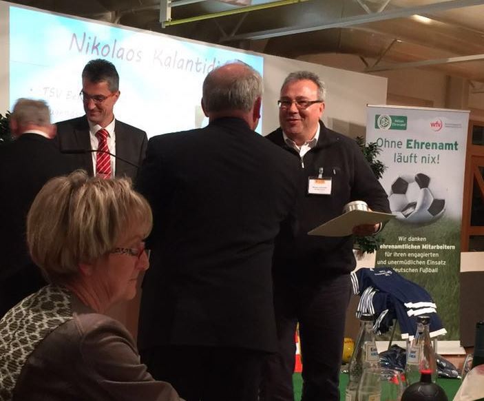 Bei der Ehrenamtsgala des Bezirks Stuttgart wurden im Rahmen der DFB-Aktion "Ehrenamt", einer Initiative des Deutschen Fußballbundes und seiner Landesverbände zur Förderung des Ehrenamts in den Fußballvereinen, elf besonders engagierte Personen mit der DFB-Ehrenamtsuhr ausgezeichnet. Zu den Preisträgern 2015 gehört auch unser Abteilungsleiter der Fußballabteilung des TSV Bernhausen Niko Kalantidis. Niko, herzlichen Glückwunsch im Namen der gesamten Abteilung und vielen Dank für dein Engagement! Diese Auszeichnung hast du dir verdient.