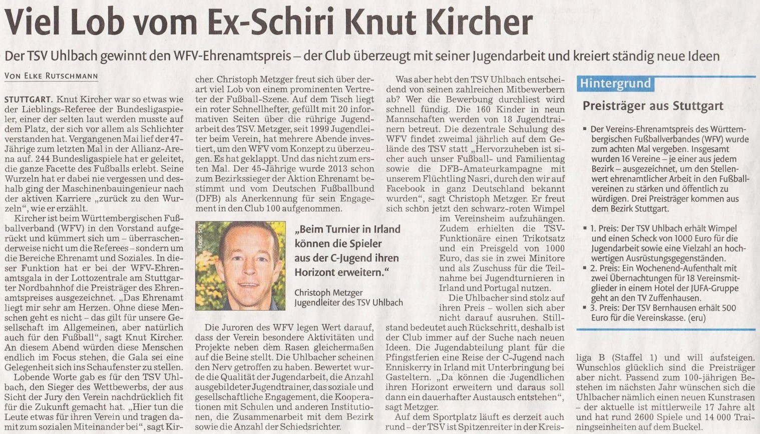 Der TSV Bernhausen war durch Abteilungsleiter Niko Kalantidis und AH-Leiter Rudi Scherrle auf der Ehrenamtsgala des Bezirkes Stuttgart vertreten! Für das ehrenamtliche Engagement wurde dem Verein in Person von Bundesliga-Schiri Knut Kircher und WFV Bezirksvorstitzende Harald Müller gedankt!
