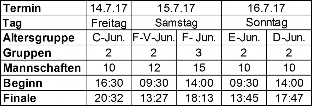 Schöne und gut organisierte F-, E-, D- u. C-Jugendturniere. Wir bedanken uns ganz herzlich bei allen teilnehmenden Vereinen und den vielen Spielern. Schade, dass ein paar Mannschaften sehr kurzfristig absagten. Dank an die Turnierleitung, Schiedsrichter, an alle Helferrinnen und Helfer und an die Kuchenspenden.