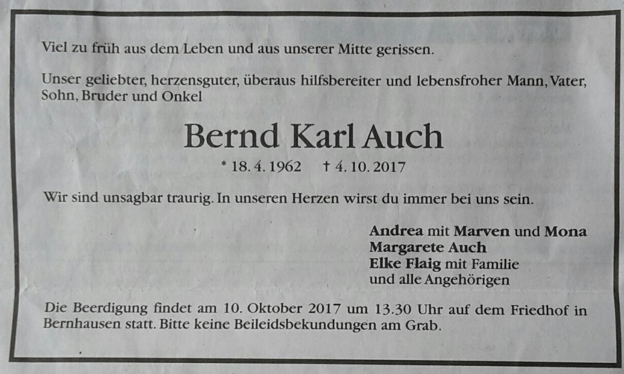 Wir haben soeben die traurige und unfassbare Nachricht erhalten, dass unser Mitglied Bernd Auch im Alter von nur 55 Jahren heute am 4.10.2017 völlig unerwartet verstorben ist.