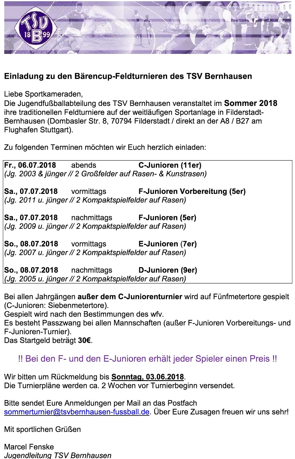 Anmeldungen oder Anfragen per Mail an sommerturnier@tsvbernhausen-fussball.de.