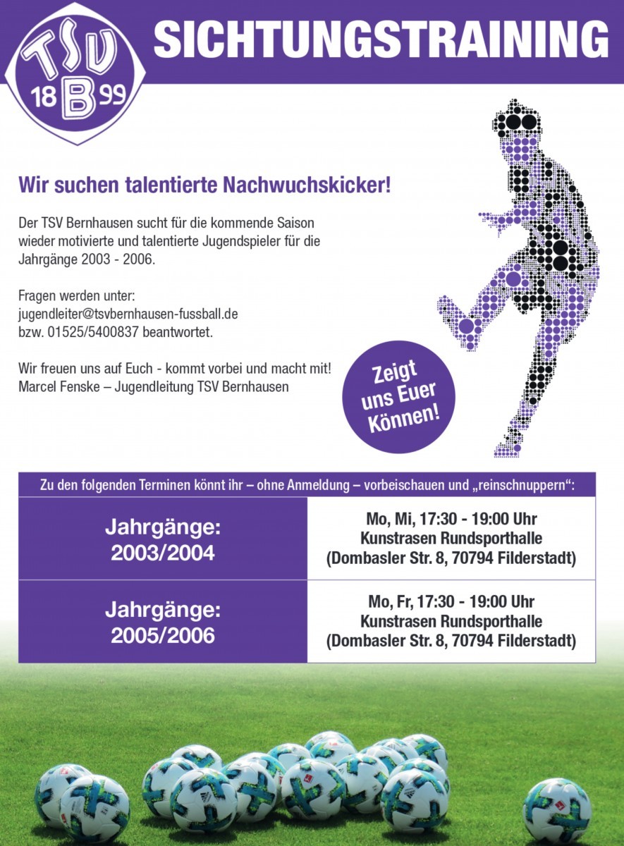Der TSV Bernhausen sucht für die kommende Saison motivierte und talentierte Jugendspieler für die Jahrgänge 2003 - 2006. Fragen werden unter: jugendleiter@tsvbernhausen-fussball.debzw. 01525/5400837 beantwortet. Wir freuen uns auf Euch - kommt vorbei und macht mit!