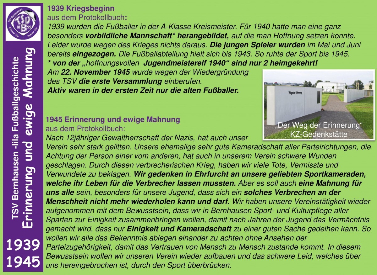 Nach 12jähriger Gewaltherrschaft der Nazis, hat auch unser Verein sehr stark gelitten. Unsere ehemalige sehr gute Kameradschaft aller Parteirichtungen, die Achtung der Person einer vom anderen, hat auch in unserem Verein schwere Wunden geschlagen. Durch diesen verbrecherischen Krieg, haben wir viele Tote, Vermisste und Verwundete zu beklagen. Wir gedenken in Ehrfurcht an unsere geliebten Sportkameraden, welche ihr Leben für die Verbrecher lassen mussten. Aber es soll auch eine Mahnung für uns alle sein, besonders für unsere Jugend, dass sich ein solches Verbrechen an der Menschheit nicht mehr wiederholen kann und darf. Wir haben unsere Vereinstätigkeit wieder aufgenommen mit dem Bewusstsein, dass wir in Bernhausen Sport- und Kulturpflege aller Sparten zur Einigkeit zusammenbringen wollen, damit nach Jahren der Jugend das Vermächtnis gemacht wird, dass nur Einigkeit und Kameradschaft zu einer guten Sache gedeihen kann. So wollen wir alle das Bekenntnis ablegen einander zu achten ohne Ansehen der Parteizugehörigkeit, damit das Vertrauen von Mensch zu Mensch zustande kommt. In diesem Bewusstsein wollen wir unseren Verein wieder aufbauen und das schwere Leid, welches über uns hereingebrochen ist, durch den Sport überbrücken.