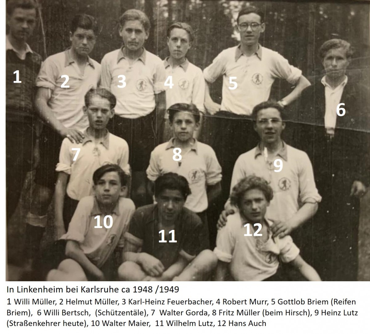 Hans Auch, selbst in der A-Jugend, kannte noch alle Namen der A-Jugend von 1949 welches bei einem Ausflug in Linkenheim (Karlsruhe) gemacht wurde. Dieser Ausflug war 1949 sicherlich etwas ganz Besonderes und eine halbe Weltreise in die Heimat des damaligen Jugendleiter Willi Lang. Es wäre schade, wenn solche Fotos und deren Geschichten nach und nach verschwinden.