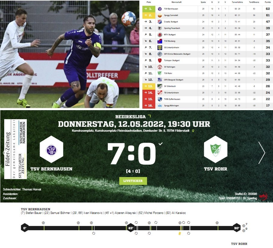 So entspannt hatte sich Christopher Eisenhardt seinen Donnerstagabend nicht vorgestellt. Der Trainer des Spitzenreiters TSV Bernhausen hatte im Vorfeld der Heimpartie gegen den TSV Rohr vielmehr eine „schwere Aufgabe“ erwartet. Am Ende stand ein 7:0-Erfolg gegen einen Sparringspartner, der seinerseits nicht viel wollte. „Ich habe keine Ahnung, was los war. Flutlicht scheint unseren Spielern nicht zu bekommen“, sagte der Rohrer Fußballchef Holger Schroeder mit sarkastischem Unterton. Obwohl der Trainer Fabio Lapeschi die exakt selbe Elf aufs Feld geschickt hatte, die am Sonntag noch mit 1:0 bei der Sportvg Feuerbach siegreich war, sah Schroeder in Bernhausen „eine komplett andere Mannschaft“. Dass die Rohrer, die davor vier ihrer fünf letzten Spiele zu Null gewonnen hatten, den Klassenprimus düpieren würden, hatte Schroeder nicht erwartet. Wohl aber, dass sie es dem Gegner zumindest etwas schwerer machen würden. Doch die Gastgeber zeigten sich hoch konzentriert. „Wir wollten eine bessere Leistung abliefern als am Sonntag beim 2:1-Sieg gegen Sillenbuch. Das ist uns gelungen“, sagte Eisenhardt, der den Seinen ein sehr gutes Spiel attestierte. Schroeder bescheinigte dem Kontrahenten gar schon jetzt Landesliga-Niveau: „Wenn die Bernhausener aufsteigen, dann sind sie auf jeden Fall würdige Aufsteiger.“