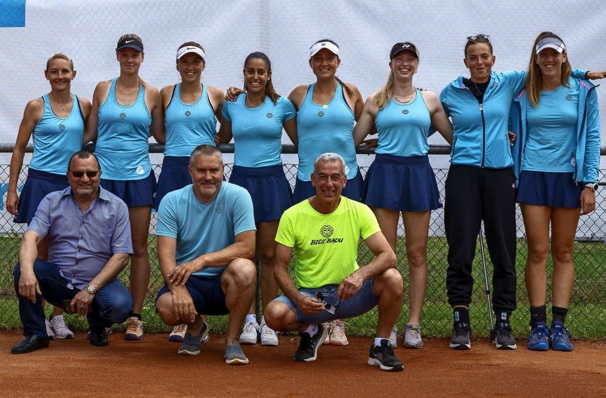 Foto: Das Meisterteam des TC Bernhausen. Hinten von links: Steffi Bachofer,Tina Cvetkovic, Justina Mikulskyte, Rebeka Kern, Leonie Küng, Marie Vogt, Vlada Koval und Sapfo Sakellaridi. Vorne von links: Doganay Özdemir vom Hauptsponsor HuT, der Teammanager Matthias Kern und der Bernhausener Clubmanager Ali Altintas. Foto: Volker Bahr/z
