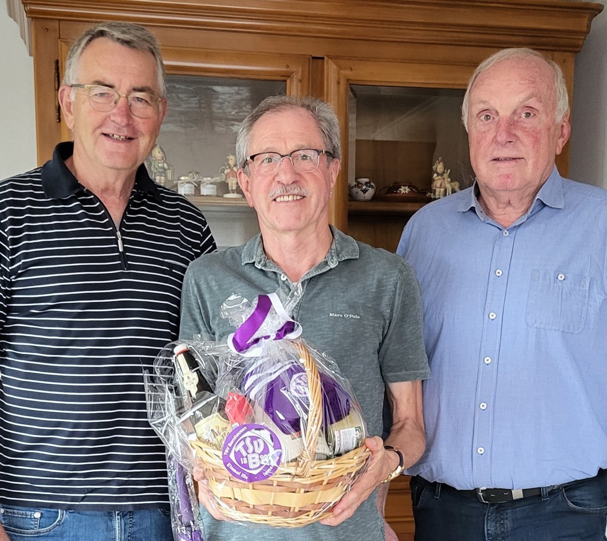 Die Glückwünsche und ein kleines Geschenk überbrachten dem ehemaligen Jugendleiter (1990-1993) und aktuellen 2. Vorstand des Förderverein Gerhard Holz (Mitte) im Namen der Abteilung und des FV Reinhard Weiß (rechts) und Rudi Scherrle.