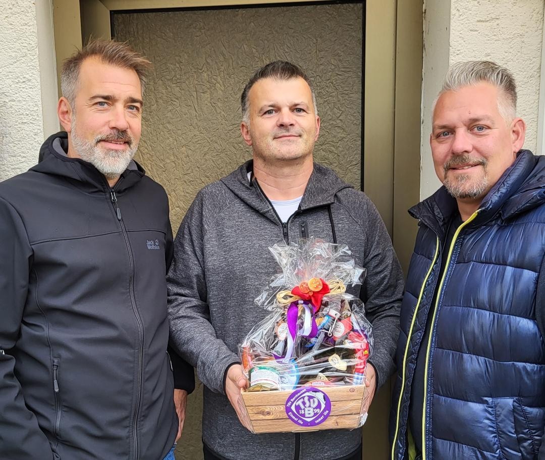 Die lila Glückwünsche, den Dank für seine Jugendarbeit und ein kleines Geschenk überbrachten Simon Verrone (1.st. AL rechts) und Stefan Scherrle (2.st. AL).