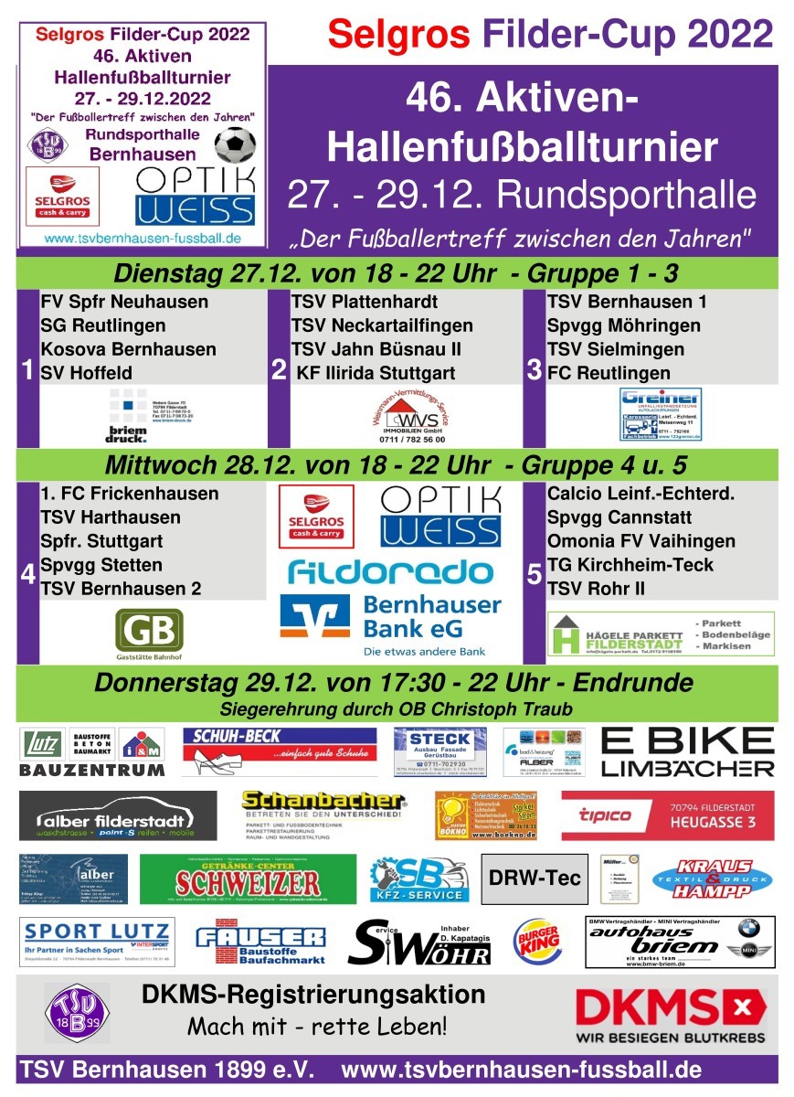 46. Aktiven- Hallenfußballturnier Selgros Filder-Cup 2022 vom 27. - 29.12.