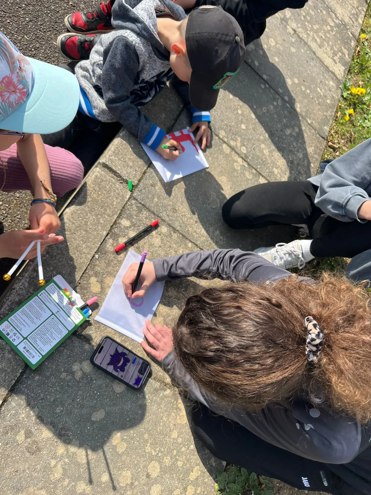 Insgesamt 24 Kinder, bestehend aus den Spielerinnen der E1 und E2 sowie zahlreichen Geschwistern, machten sich bereit für das Abenteuer. Bevor der erste Hinweis gesucht wurde, stand die Identität im Vordergrund: An der Startstation wurden mit viel Eifer und Farbe eigene Teamflaggen gestaltet. Unter dem lila Banner ging es dann los, die Truppe war bereit für die Jagd.